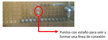 Para el caso de las líneas de conexión, que haremos con estaño, mi recomendación es aplicar estaño punto a punto y posteriormente ir uniendo los puntos hasta conseguir el camino completo. Os añado una foto por si os sirve de ayuda: