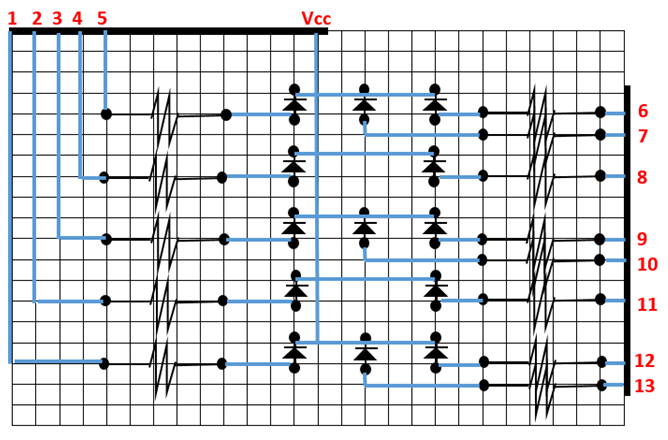 Para construir el display lo primero que tenemos que tener claro es el circuito que vamos a montar, para ello os incluyo este pequeño esquema. Imaginemos que cada uno de los puntos de cruce de una línea horizontal y una vertical de la tabla corresponde a una conexión en nuestra placa: